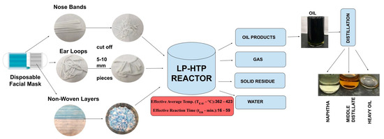 Incineration and gasification methods for converting used face masks to products have been studied previously. Incineration can treat these face masks using combustion for energy recovery but only results in an energy return of roughly 13–26% of the mask’s energy content [10,11]. Incineration can generate hazardous pollutants such as furans and dioxins, which pose serious health risks [12]. Gasification can convert face mask waste into syngas at the lab scale, containing approximately 11% H2, 6% carbon monoxide, 12% methane, and 14% hydrocarbons within the C2–C3 range. Steam gasification specifically can result in yields of 39% H2 and 22% methane at lab scale [13,14]. However, gasification requires very high temperatures, ranging from 800 °C to 900 °C, and produces lower-value products compared to oils. Furthermore, the gasification of plastic waste produces significant tar yields (up to 20–25%). Tar formation leads to reduced gas production and impacts overall process efficiency [15].