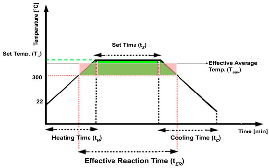 - Effective Reaction Time (tER): The time period during which the material depolymerized and conversion occurred. Based on preliminary experiments, no reaction was observed below 300 °C. Therefore, 300 °C was specified as the minimum temperature for conversion.