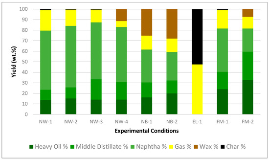 For NB-1 to NB-2, increasing the reaction temperature and time resulted in higher oil and naphtha yields and lower wax yields. For EL-1, the fragile Polyester and Spandex convert mostly to gas and char. For FM-1 to FM-2, increasing the reaction temperature and time resulted in higher naphtha yields and lower wax yield.