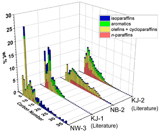 A comparison of NW-3 and KJ-1, both being PP feedstocks, shows a similar chemical composition of mostly olefins + cycloparaffins (yellow) and isoparaffins (blue). However, NW-3 has a larger carbon number range and lower aromatic (green) content than KJ-1. This result can be explained by reaction pathways reported previously [20]. With increasing temperature and time, these heavier isoparaffins are expected to convert to lighter isoparaffins, olefins + cycloparaffins, and aromatics.