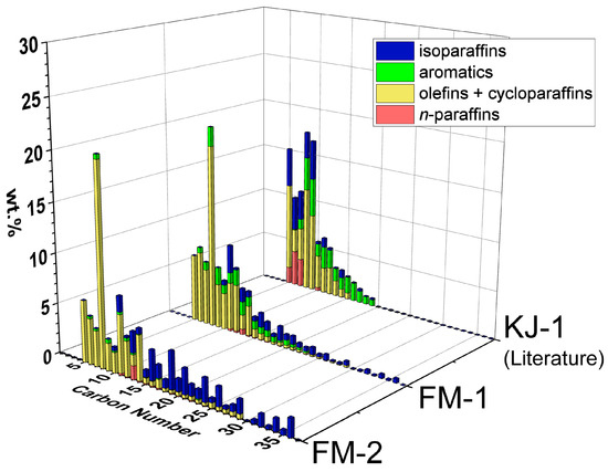 Carbon number distributions and hydrocarbon types of FM-2 and FM-1 (full masks, Table 2). The literature results of KJ-1 (PP pellets) are included for comparison [20]. Detailed compositions are tabulated in Supplementary Table S3.