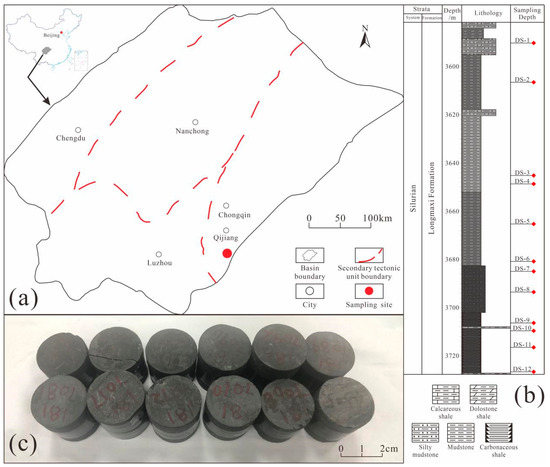 Shale samples and their sampling locations. (a) Sampling site; (b) stratigraphic column of Longmaxi Formation in southeast Sichuan Province; (c) photograph of twelve selected cylindrical shale samples for NMR measurements.