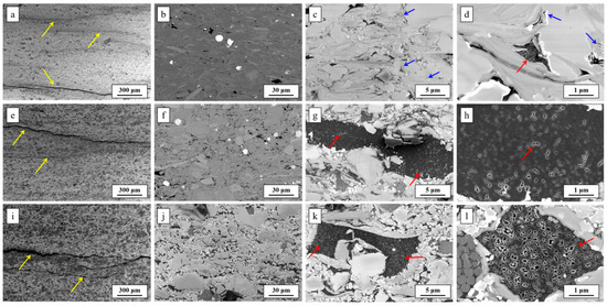 FE-SEM images of pores and microfractures in shale samples. The magnifications in (a–d), (e–h) and (i–l) are 300 times, 3000 times, 20,000 times and 80,000 times, respectively. Yellow arrows point to microfractures, blue arrows point to inorganic pores and red arrows point to organic pores.