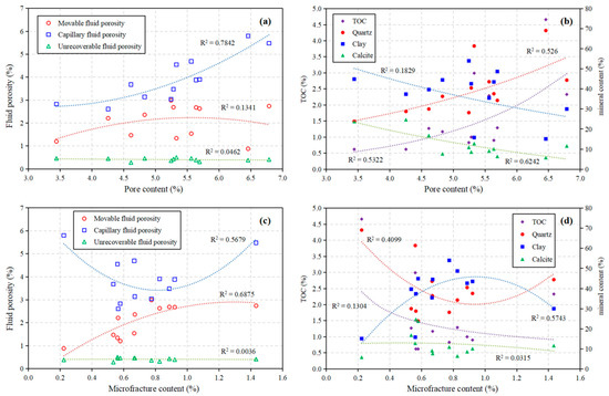 Correlation of pore content (a,b) and microfracture content (c,d) with fluid porosity and mineral content of shale samples.