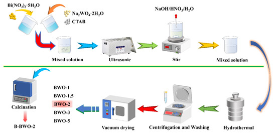The synthesis process of photocatalysts is very typical (Figure 1). Generally, the addition of 1 mmol of Bi(NO3)3·5H2O to 65 mL of deionized water was followed by thorough mixing. Then, 0.5 mmol of Na2WO4·2H2O and 0.05 g of CTAB are added to the above solution. After ultrasound treatment, the suspension solution is placed on a stirring table for agitation. In this process, a certain concentration of NaOH solution is gradually added to the solution, and the mixed solution is obtained under different pH atmospheres. The different solutions are then transferred to a Teflon-lined autoclave and kept at 120 °C for 24 h. The samples are washed three times, each with anhydrous ethanol and deionized water, and centrifuged at a rotating speed of 3500 r/min. The Bi2WO6 nanosheets needed for the experiment were obtained by vacuum drying at 80 °C for 12 h [43,44,45]. Different Bi2WO6 nanosheets were prepared by adjusting the pH levels with varying amounts of NaOH and were, respectively, labeled as BWO-2, BWO-3, and BWO-5 according to pH = 2, 3, and 5. To confirm that the carbon source came from CO2 and not CTAB, CTAB was used for comparison tests, and BWO-2 was roasted at 450 °C to obtain B-BWO-2. To compare the different catalysts, deionized water, and HNO3 solution were used to adjust the solution pH instead of NaOH, and the resulting samples were labeled as BWO-1.5 (bare Bi2WO6) and BWO-1, respectively. The preparation conditions were kept consistent across all samples.