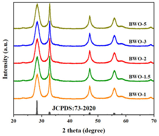 Figure 2. XRD patterns of BWO-1, BWO-1.5, BWO-2, BWO-3, and BWO-5.