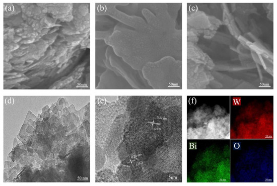 Figure 3. SEM images of (a) BWO-1.5, (b) BWO-2, and (c) BWO-3; (d,e) TEM images of BWO-2; (f) STEM; and the corresponding elemental mapping images of BWO-2.