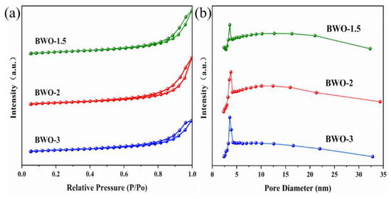 Figure 4. (a) N2 adsorption isotherms at 298 K; (b) pore diameter distribution curves of BWO-1.5, BWO-2, and BWO-3.