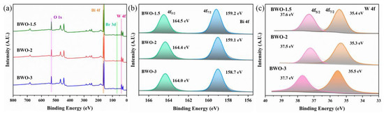 Figure 5. (a) XPS spectra, (b) Bi 4f spectra, and (c) W 4f spectra of BWO-1.5, BWO-2, and BWO-3.