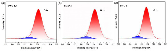 Figure 6. O 1s spectra of (a) BWO-1.5, (b) BWO-2, and (c) BWO-3.