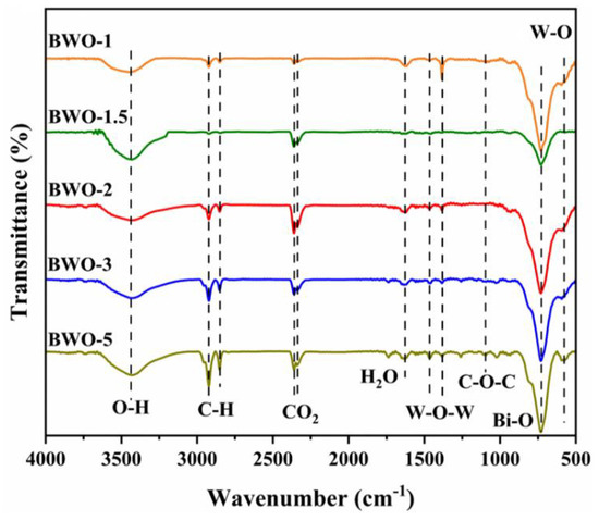 Figure 7. FTIR spectra of different photocatalysts: BWO-1, BWO-1.5, BWO-2, BWO-3, and BWO-5.
