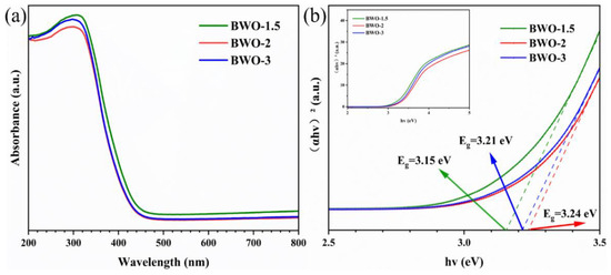 Figure 8. (a) UV–visible spectra and (b) plots of band gap energy of photocatalysts: BWO-1.5, BWO-2, and BWO-3.