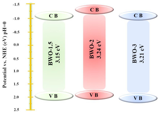 Figure 10. Band gap structure diagram of photocatalysts: BWO-1.5, BWO-2, and BWO-3.