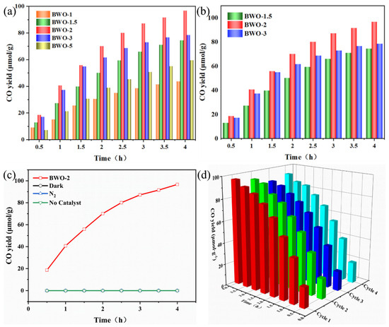 In this study, we developed a synthesis method for Bi2WO6 that involved the addition of sodium hydroxide to adjust the band gap structure. Compared with Bi2WO6 obtained by hydrothermal reaction with the modification of pH [40,41,42], we were able to produce Bi2WO6 nanosheets (BWO-2) with a stable sheet structure and a wider band gap under a moderate condition without impurity ions introduced. As a result, the BWO-2 photocatalysts exhibited better photocatalytic performance, with significantly improved CO yield and stable photocatalytic ability even after multiple activity tests. Our findings could provide valuable insights for the development of bismuth tungstate series photocatalysts.