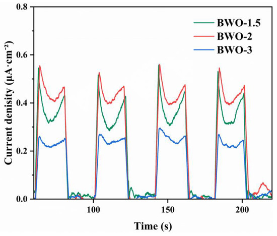 Figure 12. Photocurrent response curves of BWO-1.5, BWO-2, and BWO-3.