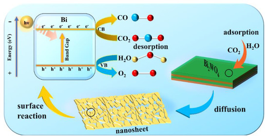 In the adsorption–desorption process, physical adsorption of CO2 and H2O molecules occurs on the surface of the photocatalysts, and both diffuse into the internal pore of Bi2WO6. CO2 adsorption and activation are the prerequisites and main obstacles for the photocatalytic reaction. In this process, a high adsorption amount of CO2 is conducive to the formation of ·CO2 anions and ·COOH [93], and the presence of both can be considered as important signs of the successful activation of CO2. Redox reaction happens at the active site on the pore surface, and the generated CO gradually moves away from the active site and leaves the photocatalyst surface through diffusion. In the course of the photocatalytic CO2 reaction, Bi2WO6 receives enough light energy to generate excited electrons on its energy band, and the photogenerated electrons on the lower energy valence band (VB) transition are transferred to the higher energy vacant orbital conduction band (CB) Meanwhile, this process leaves an equal number of photogenic holes in the valence band, thus generating electron–hole pairs. The photogenerated carrier activation reaction is shown as follows: