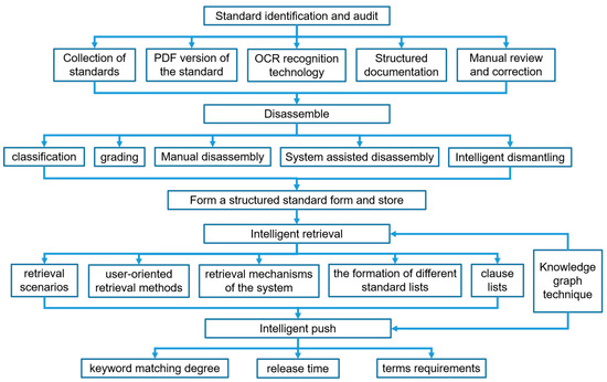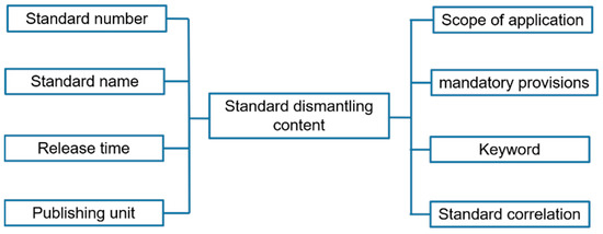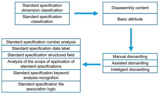 The data structuring, disassembling, and storing of standards are important links in the establishment of a standard database. Disassemble the identified and audited standards. First, the standards are classified according to their basic attributes and keywords; then, the standards are graded according to first-level titles and second-level titles. Finally, the standards are disassembled by manual dismantling, system-assisted dismantling, or intelligent dismantling strategies, and the structured storage of the standard is completed. The disassembly and storage block diagram of standards is shown in Figure 3, which mainly includes three parts: classification and grading of standards, disassembly of standards, and storage of standards.
