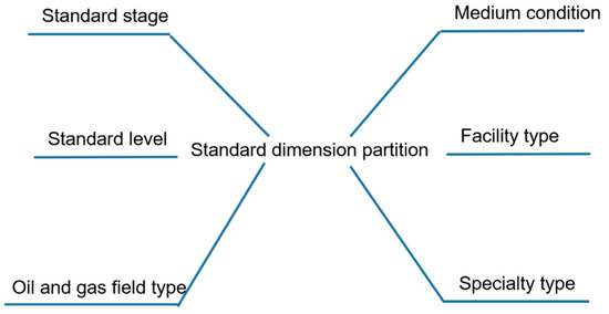 According to the classification principle of standard, and combined with the construction characteristics of oil and gas fields, six dimensions are divided into multiple attributes of standards for standard classification, as shown in Figure 4. The standard classification involves standard stage, standard level, oil and gas field type, medium conditions, facility type, and specialty type, which are used to guide the classification of standards into repositories and support the rapid positioning of specific standards during retrieval. The application stages include design, construction, and acceptance. The standard levels include international standards, national standards, and industry standards. The oil and gas field types include oil fields, gas fields, and oil and gas fields. The medium conditions include oil, natural gas, shale gas, and tight gas. The facility types include pipelines, stations, and treatment plants. The specialty types include process, structure, corrosion prevention, and equipment. After the standard is divided, the associated standards are extracted from the standard database by combining basic attributes such as standard number, standard name, publication time, and keywords to form a list of associated standards.