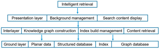 Intelligent retrieval is the most direct way to apply the standard database. When the user queries and searches, the user’s natural language query enters the retrieval system after semantic analysis and processing and then matches the content in the knowledge base. The integrated feedback results are presented to the user in a visual form. It improves the efficiency of keyword search and query. The intelligent retrieval system is divided into three parts: the bottom layer, middle layer, and presentation layer. The hierarchical diagram of the intelligent retrieval system is shown in Figure 6.