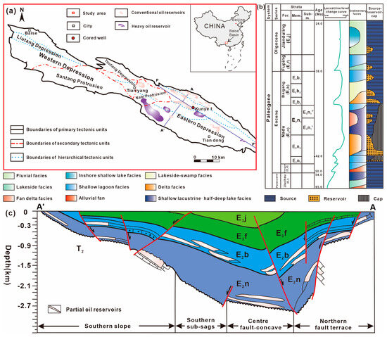 Location and geological profile of the Nadu Formation in the Baise Basin. (a) study area of the Baise Basin; (b) generalized stratigraphy of the Baise Basin; (c) geological cross section. (modified from Liu et al. [8] and Chen et al. [12]).