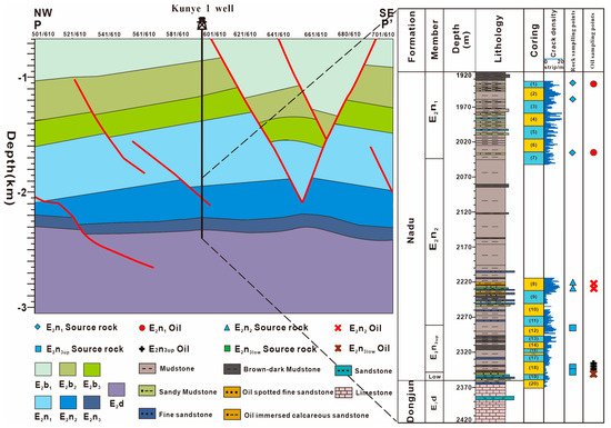 The source rocks of the Nadu Formation include three members: E2n1, E2n2, and E2n3. Due to the development of a small number of coal lines at the bottom of E2n3, they are further divided into two sections: E2n3up and E2n3low (Figure 2). Eight residual oil samples from high-angle joint fissure surfaces and eight source rocks were selected for analysis. The sampling depths ranged from 1935.5 m to 2343.81 m. Among them, the oil samples are residual oil extracted from high-angle joint fissures surfaces. The rock samples comprise blocky mudstone and sandstone. The depth distribution of the samples is displayed in Figure 2.