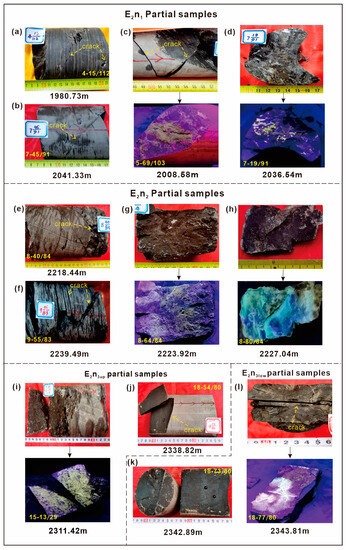 Pictures of high-angle jointed fissures rock cores and residual oil on fissure surfaces. Note: (a,b) E2n1 has developed multi-angle fissures, mainly at medium to low angles, (c,d) with uneven oil content on the fissure surface and yellow fluorescence dry light; (e,f) E2n2 is mainly developed with high-angle fissures, (g,h) and the fissure surface is oily with fluorescent dry light yellow and wet light yellow; (j,k) E2n3up and E2n3low are mainly characterized by high-angle fissures, with a large number of vertical fissures developed. (i,l) The oil content on the fissure surfaces is uniform, fluorescent dry illuminated yellow, and wet illuminated yellow.