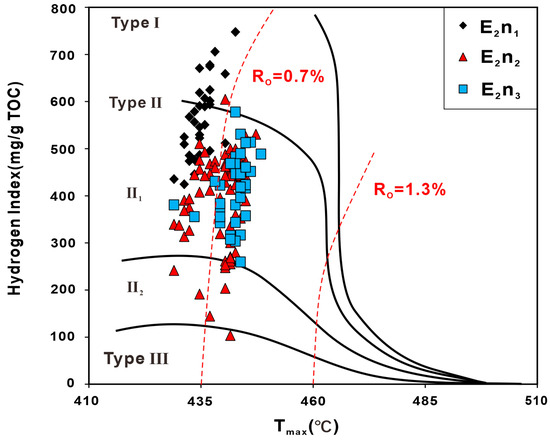 The organic matter types in the study area are mainly type II1, with a small amount of type I, type II2, and type III (Figure 4). In terms of organic matter maturity, the E2n3 samples have the highest pyrolysis peak temperature (Tmax) with an average of 440 °C. The E2n2 samples display higher Tmax values, ranging from 430 °C to 440 °C, compared to those of E2n1 (430 °C on average). The majority of Tmax values range from 430 °C to 440 °C, indicating that most samples are in low maturity to mature stage [17].