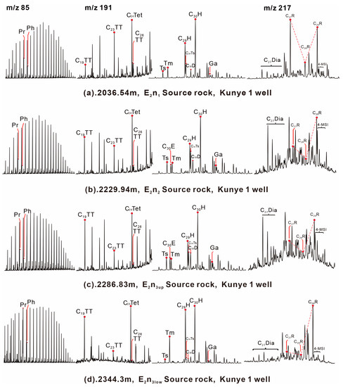 Tricyclic terpanes are common in petroleum and source rock extracts and may originate from prokaryotic cell membranes [22]. C19 tricyclic terpanes (C19TT) are mainly derived from terrestrial higher plants [23], while C23 tricyclic terpanes (C23TT) may be derived from algae [24,25]. The abundance of C24 tetracyclic terpene (C24Tet) is high in all samples of source rock. The E2n2 and E2n3 source rocks have higher C19 tricyclic terpanes compared to the E2n1 source rocks. The C19TT/C23TT and C24Tet/C26TT values of the E2n2 and E2n3 samples are higher, ranging from 1.21 to 2.29 (1.89 on average) and 1.66 to 2.81 (2.24 on average), respectively. The C19TT/C23TT and C24Tet/C26TT values of the E2n1 source rocks are relatively low, ranging from 0.43 to 0.67 (0.52 on average) and 1.11 to 1.91 (1.51 on average), respectively (Table 3). The ETR = (C28TT + C29TT)/(C28TT + C29TT + Ts) ratio of the E2n1 source rocks ranges from 0.28 to 0.46 (0.38 on average); the E2n2 and E2n3up source rocks have greater ETR ratios than the E2n1 source rocks, ranging from 0.49 to 0.59 (0.54 on average). The ETR ratio of the E2n3low source rocks is the highest, which is 0.76. The hopanes were detected in all source rock samples, ranging from C27 to C35, with the most significant peak at 17α (H)-hopane (C30H) (Figure 5). C27 hopane display C27 18α(H)-22,29,30-trisnorneohopane (Ts) and C27 17α(H)-22,29,30-trisnorhopane (Tm). The Ts/Tm values of the E2n2 and E2n3up source rocks are close, with an average value of 1.15 (ranging from 1.12 to 1.24); the average value of E2n1 source rock is 0.58. The E2n3low source rocks has a very low Ts value, and the average value of Ts/Tm is 0.14. The abundance of diahopanes is high due to a specific organic matter source and diagenesis conditions [26]. The abundance of 17a (H)-C30 diahopane (C30D) in source rocks of four layers is different. The average C30D value of the E2n3low source rock is 0.14. The C30D values of the E2n2 source rocks are slightly higher, ranging from 0.25 to 0.28, with an average value of 0.27. The C30D values of the E2n3up samples are relatively high, ranging from 0.37 to 0.38, with a mean of 0.38. In contrast, the abundance of C30D in the E2n1 source rocks are extremely low, ranging from 0.05 to 0.06, with an average of 0.06. Gammacerane (Ga) is not dominant in source rocks, and the Ga/C30H value in each source rocks are significantly lower, ranging from 0.05 to 0.19 (0.12 on average).