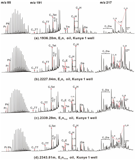 All oil samples contain hopanes ranging from C27 to C35, with the most prominent peak at 17α(H)-hopane (C30H), as shown in Figure 6. The Ts/Tm ratios of the E2n2 and E2n3up oil samples are both relatively high, ranging from 0.83 to 1.21, with an average of 1.06. The E2n1 and E2n3low oil samples show lower Ts/Tm values than the E2n2 and E2n3up samples, ranging from 0.50 to 0.62 (0.57 on average). In addition, Ga is present in almost negligible amounts in all oil samples, with Ga/C30H ratios quite low, varying between 0.06 and 0.16 (0.11 on average). The C30D/C30H ratios of the E2n2 + E2n3up and E2n3low oil samples are greater than those of the E2n1 samples, which are in the range of 0.18–0.41 (0.28 on average). The C30D/C30H ratios of the E2n1 oil samples are significantly low (0.05 on average).