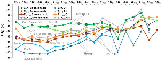 The isotopic composition of organic carbon in oils is primarily related to the isotopic compositions of the source rocks [62,63,64,65]. The carbon isotopic composition is an effective approach to oil/source correlation. The carbon isotopes of certain individual hydrocarbons in some samples have a limited range of identified compounds due to the significant loss of the lighter components and interference from the heavier part caused by the hopane series. However, through the detection of some compounds, it can also be seen that the closer δ13C value and similar trends can be used for oil source comparison. In general, the δ13C difference between oils does not exceed 2–3‰ for oils of similar maturity from the same source rock [27,28].
