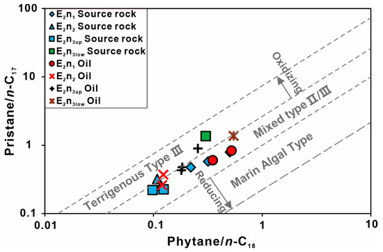 Firstly, some parameters of biomarkers indicating the organic matter source and the sedimentary environment were analyzed. The ratios of Pr/Ph in the Nadu Formation of the Baise Basin (0.73–4.49) indicate that organic matter from the lake was present throughout the deposition period. It suggests that the sedimentary environment was likely aerobic rather than anoxic [38,39]. The Pr/Ph ratio higher than 3 typifies an oxic depositional environment under high terrigenous OM input, whereas a ratio of <0.8 is indicative of an anoxic environment [40]. The Pr/Ph ratios of the E2n1 oil samples are relatively low, indicating that it has the suboxic conditions of deposition, and are possibly derived from the E2n1 source rocks with low Pr/Ph ratios. The higher Pr/Ph ratios (1.05) in the E2n2 and E2n3up oil samples indicate oxidizing conditions of deposition, which are close to the E2n2 and E2n3up source rocks. The E2n3low oil samples and source rocks show the highest Pr/Ph ratio, indicating strong oxidizing conditions of deposition with high terrestrial OM input. The E2n2, E2n3up, and E2n3low samples show relatively higher Ph/n-C18 and Pr/n-C17 values than the E2n1 samples. As shown in Figure 8, we can find that the oils collected from the Nadu Formation are sourced from rocks under an oxidizing environment with aquatic and terrigenous OM inputs [41].