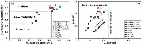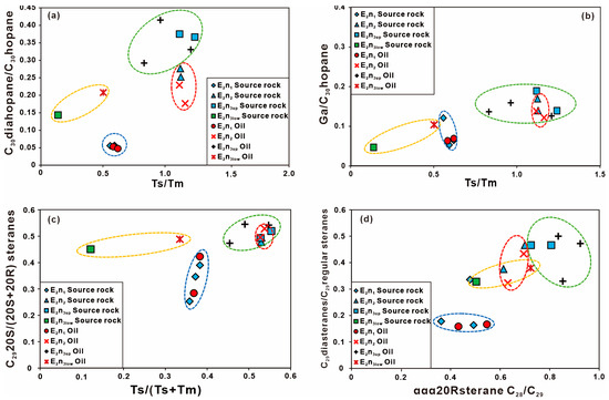 Group I: E2n1 oils. The E2n1 oil samples have high resin and asphaltene content, low saturates content, low Pr/Ph, low Ga content, low C19TT/C23TT and C24Tet/C26TT, low C2920S/(20S + 20R) and C29ββ/(αα + ββ), low Ts/Tm, low C30D content, low diasteranes content, low 4-MSI, and the lowest δ13C value, indicating that the source rocks of oils were deposited under a suboxic environment with mixed inputs derived from planktons and land plants. The maturity of the E2n1 is lower and the content of dinoflagellates is less. Cross plots of C2920S/(20S + 20R) versus C29ββ/(αα + ββ) (Figure 9a), C29ααS/R versus C29ββR/ααR (Figure 9b), Ts/Tm versus C30diahopane/C30hopane and Ga/C30hopane (Figure 10a,b), Ts/(Ts + Tm) versus C2920S/(20S + 20R)steranes (Figure 10c), and C29D/C29R steranes versus C28R/C29R steranes (Figure 10d) illustrate a good correlation between the E2n1 oils and the E2n1 source rocks and distinct differences between the E2n1 oils and the E2n2, E2n3 source rocks [66].