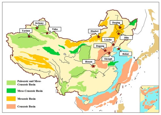 China possesses abundant heavy oil resources, ranking as the fourth-largest country in the world in terms of heavy oil reserves [1,2]. Currently, a large number of heavy oil fields have been discovered in 15 large and medium-sized oil and gas-bearing basins and regions, primarily in the Liaohe Oilfield, Xinjiang Karamay Oilfield, Shengli Oilfield, and Henan Nanyang Oilfield [3]. The distribution of heavy oil fields in China is shown in Figure 1. Heavy oil and bitumen resources account for more than 20% of the total petroleum resources, with a proven reserve of 43.5 × 108 t [1]. These resources are crucial for China’s strategic security and energy independence [4,5]. In recent years, the newly discovered heavy oil resources in China have exhibited declining quality characteristics, including shallow burial, thin reservoir thickness, high viscosity, and scattered distribution [6,7]. For these shallow- and thin-layer heavy oil resources, due to their high viscosity and fast heat dissipation in a thin layer, there is a low heat utilization efficiency [8,9,10,11]. After many years of steam injection development, phenomena such as high reservoir integrated water cut, serious steam channeling, lower oil/steam ratio, and dispersion of residual oil occur, which lead to poor development and a low degree of reservoir utilization [12]. Henceforth, it is imperative to change the development approach and improve recovery in order to ensure a steady and continuous growth in heavy oil production capacity [13,14].