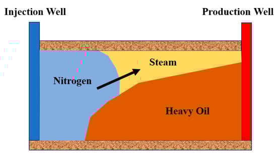 It has been discovered that utilizing nitrogen foam-assisted steam flooding for the development of shallow- and thin-layer heavy oil reservoirs can effectively address the challenges encountered during pure steam injection development [15,16,17]. The primary mechanisms of nitrogen foam-assisted steam flooding can be summarized as follows: (1) Elevation of formation pressure: nitrogen, with its high compression and volume coefficients, plays a crucial role in elevating the formation pressure [18]. When steam and nitrogen are injected into the formation, nitrogen is compressed and stores energy under pressure. As production wells are produced, the formation pressure decreases, causing the steam to condense into hot water. Meanwhile, nitrogen rapidly expands in volume, driving the heated viscosity-reducing crude oil. With the continual decrease in the formation pressure, nitrogen continues to expand while stabilizing it effectively. This allows for better utilization of the steam function [19,20]. (2) Improve the range of steam coverage: nitrogen injected into the formation can quickly break forward, carrying high-temperature steam for transportation and heating crude oil in distant oil reservoirs through stored heat breakthrough. Additionally, injecting a high-temperature-resistant foaming agent into the formation with nitrogen can generate bubbles in the near-well zone, which seal channels due to the Jamin effect and force steam to enter reservoirs with poor physical properties, thereby expanding the range of steam action [21,22]. (3) Thermal insulation: under the influence of gravity, nitrogen forms a superimposed layer at the top of the oil reservoir, creating a “thermal insulation blanket” due to nitrogen’s low thermal conductivity. This blanket minimizes heat loss from the reservoir and enhances the thermal efficiency of steam utilization [23]. The schematic of nitrogen-assisted steam flooding is depicted in Figure 2.