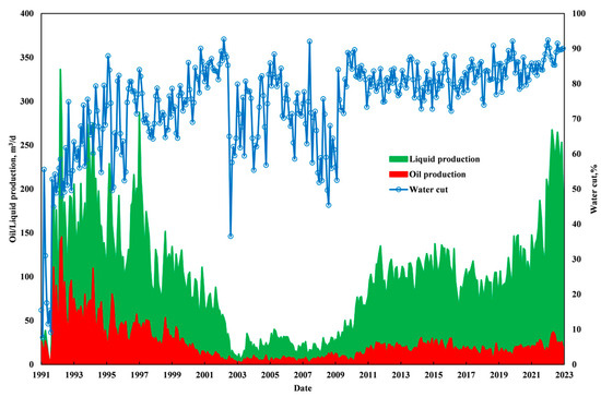 With the extension of the development period, the target area has exhibited a production status characterized by high water cuts and low oil production rates. Steam channeling has intensified, reservoir porosity and permeability have increased, and reservoir depletion has become severe. In some areas, a ‘Hot worm hole’ has formed, resulting in extremely low steam utilization efficiency. The heating radius and utilization radius are difficult to expand further, leading to a year-by-year decline in the oil-to-steam ratio and deteriorating development performance [31,32]. It is now imperative to change the development approach and enhance the ultimate oil recovery.