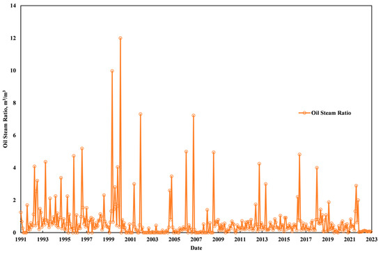 In Figure 6, where is 1.281 and is 0.0331, the correlation coefficient is 0.9897. Assuming an ultimate oil/steam ratio of 0.1, these values can be applied to Equations (4) and (5), and the recoverable reserves for the six well groups in the target area can be determined. Substituting into Equation (3) provides the predicted recovery using steam injection, which is at 39.67%.