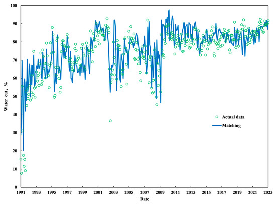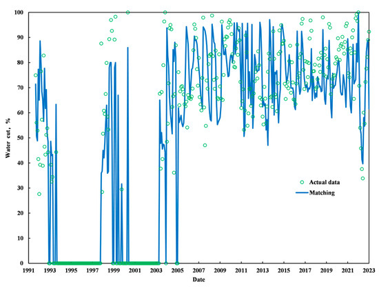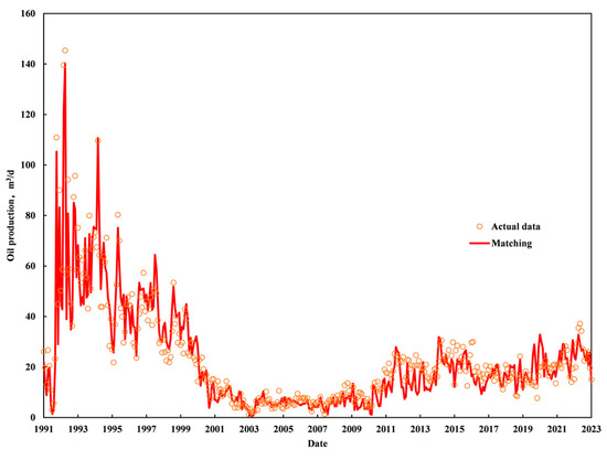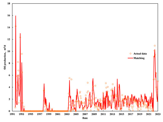 The historical fitting results for the shallow heavy oil reservoir in Block A and a typical individual well are shown in Figure 10, Figure 11, Figure 12 and Figure 13. It can be observed in these figures that both the overall reservoir and the individual well exhibit good historical fitting results, which can be utilized for the optimization research of nitrogen foam-assisted steam flooding parameters in Block A.