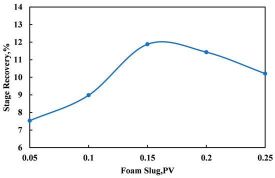 According to the analysis of reservoir thermal connectivity and steam channeling volume after the development of thick oil reservoir steam injection in Block A, the steam channeling volume of the well group in Block A was calculated to be 35.1432 × 104 m3. This value serves as the design basis for the quantity of nitrogen foam. The sizes of foam slug volumes in the well group of Block A were designed at different values, namely 0.05, 0.1, 0.15, 0.2, and 0.25 times the steam channeling volume, with an oil/steam ratio of 0.1 as the termination condition. The foaming agent’s mass concentration was maintained at 0.5 wt%, and the steam injection intensity and injection/production ratio were based on the optimization results mentioned earlier. The simulation results are presented in Table 5 and Figure 16. Based on the calculations, the stage oil recovery increases with the foam slug volume, reaching a peak when the nitrogen injection volume is 0.15 times the steam channeling volume. Hence, it is observed that the most effective performance of nitrogen foam-assisted steam flooding is achieved when the nitrogen injection volume is set at 0.15 times the steam channeling volume. At this point, the foaming agent and nitrogen exhibit their maximum foaming capability, resulting in superior plugging of highly permeable channels. Therefore, a foam slug volume equivalent to 0.15 times the steam channeling volume is the most suitable choice for Block A.