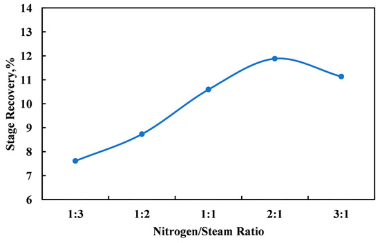 The nitrogen/steam ratio was set at different values: 1:3, 1:2, 1:1, 2:1, and 3:1, with an oil/steam ratio of 0.1 as the termination condition. The foam slug size was kept at 0.15 times the steam channeling volume, the mass concentration of the foaming agent was maintained at 0.5 wt%, and the previously optimized values for steam injection intensity and injection/production ratio were utilized. The simulation results are presented in Table 6 and Figure 17. Based on the simulation results, it is evident that as the gas–liquid ratio increases, the performance of nitrogen foam-assisted steam flooding improves. When the nitrogen/steam ratio is set at 2:1, the stage oil recovery reaches its maximum value, which is 11.88%. At this point, the nitrogen foam exhibits good stability and possesses strong water-blocking and oil-displacing capabilities. If the ratio is further increased, it may lead to premature gas breakthrough, which would have an adverse impact on the stability of the nitrogen foam. Therefore, the optimal nitrogen/steam ratio is 2:1.