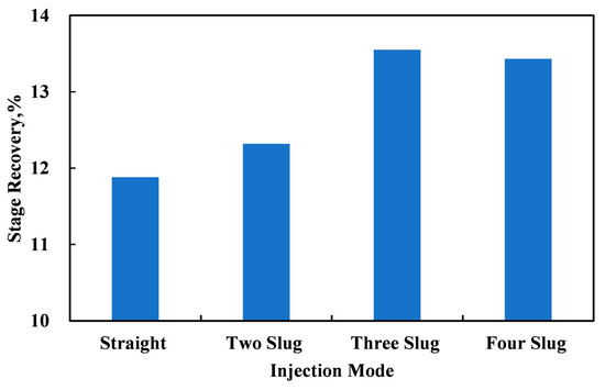 While maintaining a consistent foaming agent concentration, nitrogen foam volume, steam injection intensity, and injection/production ratio, injection modes were tested individually, including continuous injection, two-foam-slug injection, three-foam-slug injection, and four-foam-slug injection. The termination condition was an oil/steam ratio of 0.1. The simulation results are presented in Table 7 and Figure 18. By comparing the results of these four simulation methods, it can be observed that dividing a single foam slug into 3–4 segments for intermittent injection produced the best oil recovery compared to the continuous injection mode. This injection mode allows nitrogen foam to be more uniformly distributed within the reservoir, reducing the impact of variations in underground reservoir permeability, and effectively preventing premature gas breakthrough. Therefore, regarding the injection mode, it is advisable to choose the intermittent injection mode with 3–4 foam slug segments.