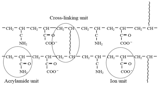 However, the molecular structure of PPG (preformed particle gel) was designed by Daqing Oilfield based on the plugging adjustment requirements of heterogeneous reservoirs after polymer flooding and matching reservoir pores, as shown in Figure 1. The acrylic acid and cross-linked monomer with a double acrylamide head group were selected as the ionic and cross-linked units, respectively. Acrylamide is the main body of the PPG; the ion unit regulates its swelling performance, and the cross-linked unit is used to construct the gel skeleton. The cross-linked monomer has two acrylamide reaction head groups, which can cross-link different molecular chains and construct the gel network. In addition, its reaction head group is the same as the primary material (acrylamide) and has good polymerization ability. At the same time, the flexibility of gel molecules is adjusted using carbon chains with a specific length as spacer groups between the two reaction head groups. Since PPG is composed of 4–6 allyl diacrylamide copolymerized with acrylamide and acrylic acid, it has higher elasticity, compressive strength, and larger expansion [18]. Therefore, PPG can resist high pressure and has good deformation recovery ability, leading to a successful pass through small pores without breaking. The recovery rate is over 70%.