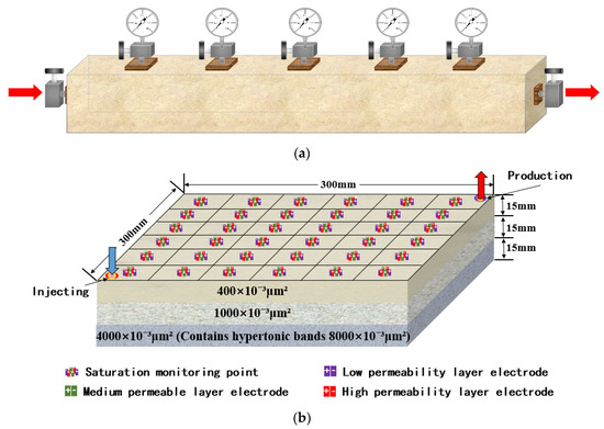 (1) Four kinds of artificial cylindrical cores with different permeability were used. The cylindrical cores were vacuumed and saturated with water until the pressure gauge reached −0.1 MPa. The vacuumed core was loaded into the core holder and 10 MPa confining pressure was applied.