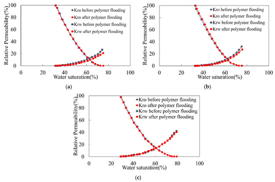 Oil–water relative permeability curves before and after polymer flooding. (a) The permeability is 500 × 10−3 μm2, (b) the permeability is 1000 × 10−3 μm2, and (c) the permeability is 4000 × 10−3 μm2.