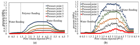 Pressure curve at each point: (a) polymer flooding and (b) heterogeneous flooding.