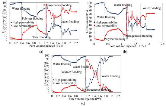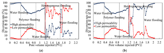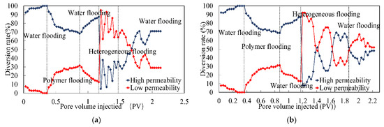Figure 8b and Figure 10 compare the flow rate curves under different injection rates. As the injection volume of PPG increases to a certain value after water flooding, the diversion volume of the low permeability core exceeds that of the high permeability core. The flow diversion rate of the high permeability layer is higher than that of the low permeability layer when injecting 0.3 PV of PPG, with a ratio of the high to low permeability layers of 7:3. When increasing the injection volume to 0.7 PV, the diversion ratio of the high and low permeable layers is 5:5. PPG first enters the high permeability core and increases the seepage resistance of the high permeability core. Therefore, when the injection amount of PPG is small, the seepage resistance of the low permeability core after flooding is still higher than that of the high permeability core due to an inadequate PPG volume to fully seal high flow channels. However, a large amount of PPG enters the low permeability core after PPG blocks the high permeability core if the PPG injection volume is too high, resulting in a similar flow rate in the high and low permeability layers. PPG can dynamically adjust the shunt flow of heterogeneous cores by alternately plugging high and low permeable layers. However, the injection pressure loss is severe when substantive PPG enters the low permeability layer due to the low permeability layer damage, causing a weak shunt effect of high and low permeability layers. Therefore, the optimal PPG injection volume is 0.5 PV.