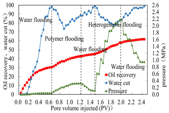 (3) Polymer flooding and system flooding were conducted, respectively, to achieve pressure stability. Finally, the water flooding was performed until pressure stabilization, and the permeability Kp1 and Kp2 were calculated again.
