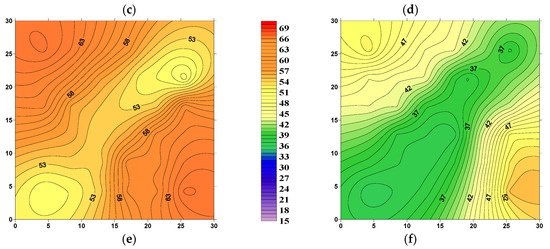 Oil saturation distributions (a) before injection of the heterogeneous system in layer with high permeability, (b) after injection of the heterogeneous system in layer with high permeability, (c) before injection of the heterogeneous system in the middle permeable layer, (d) after injection of the heterogeneous system in the middle permeable layer, (e) before injection of the heterogeneous system in layer with low permeability, and (f) after injection of the heterogeneous system in layer with low permeability.