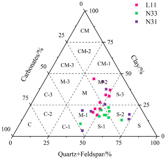 Ternary diagram of Well L11, Well N31, and Well N31 of Longmaxi shale mineralogy. (S: Siliceous shale lithofacies; S-1: Carbonate-rich siliceous shale lithofacies; S-2: Mixed siliceous shale lithofacies; S-3: Clay-rich siliceous shale lithofacies; M: Mixed-shale lithofacies; M-1: Calcareous/siliceous mixed-shale lithofacies; M-2: Argillaceous/siliceous mixed-shale lithofacies; M-3: Argillaceous/calcareous mixed-shale lithofacies; CM: Argillaceous shale lithofacies; CM-1: Silica-rich argillaceous shale lithofacies; CM-2: Mixed argillaceous shale lithofacies; CM-3: Carbonate-rich argillaceous shale lithofacies).