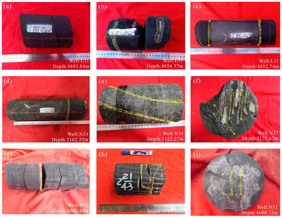 Photographs of fractures and pyrite stripes in shale core samples from three wells. (a) Macro-tectonic fractures, Well: L11, Depth: 4883.84 m; (b) Calcite lenticular bodies, Well: L11, Depth: 4854.37 m; (c) Pyrite inclusions, Well: L11, Depth: 4852.74 m; (d) Horizontal fracture, Well: N33, Depth: 3162.32 m; (e) Highly angular tectonic fractures, Well: N33, Depth: 3122.27 m; (f) Calcite veins adhering to the surface, Well: N33, Depth: 3125.67 m; (g) Pyrite interlayer, Well: N31, Depth: 4601.44 m; (h) Netted cracks, Well: N31, Depth: 4588.80 m; (i) Mirror scratches, Well: N31, Depth: 4600.72 m.