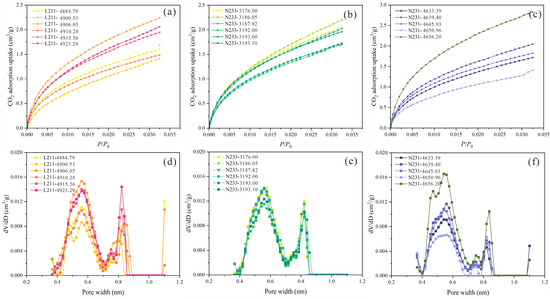 CO2 adsorption curves and PV distribution characteristics of three wells (L11, N33, and N31). (a) DBWD for CO2 adsorption; (b) LBWD for CO2 adsorption; (c) DBSD for CO2 adsorption; (d) DBWD for dV/dD micropore volume; (e) LBWD for dV/dD micropore volume; (f) DBSD for dV/dD micropore volume.